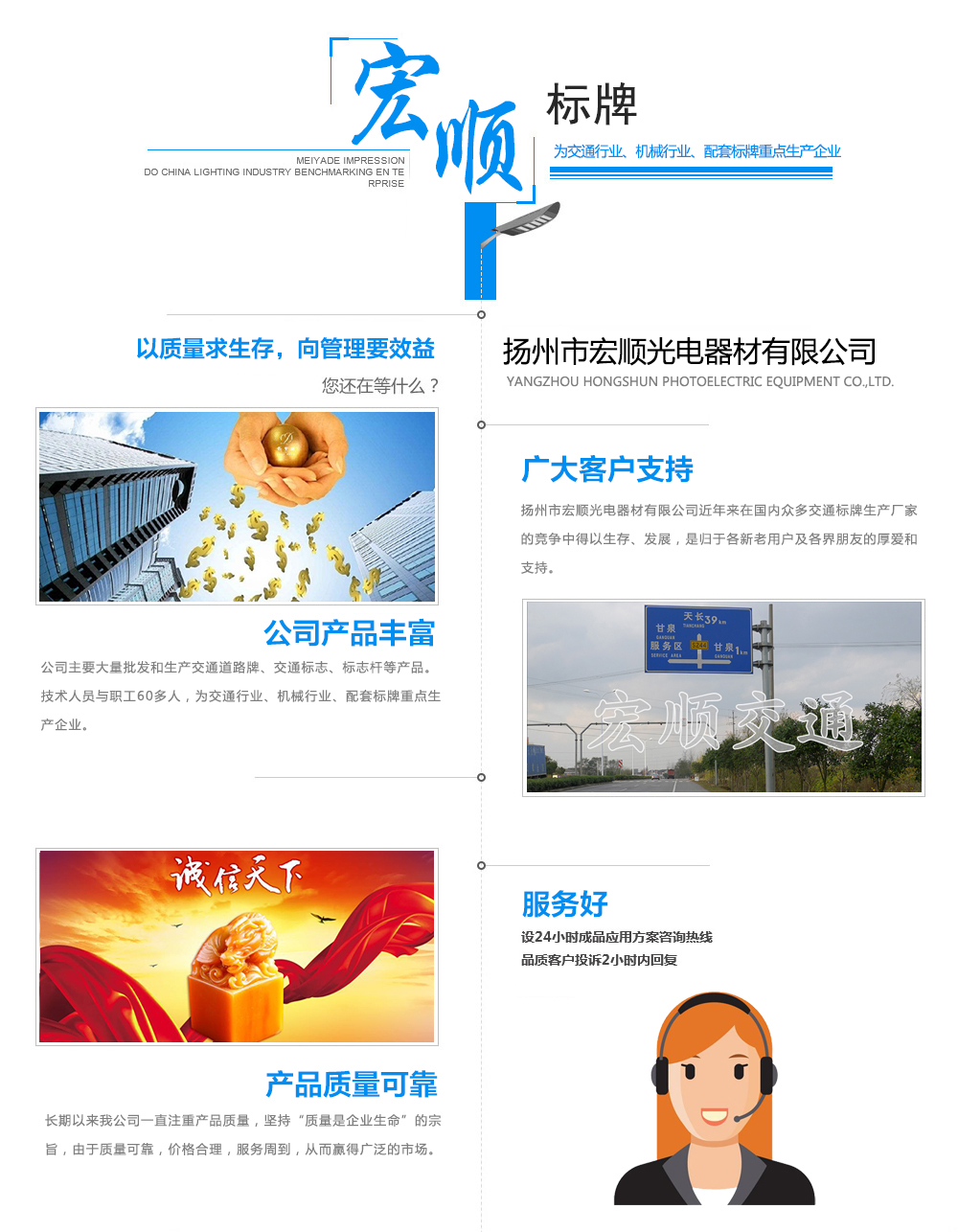 揚(yáng)州市宏順光電器材有限公司近年來(lái)在國(guó)內(nèi)眾多交通標(biāo)牌生產(chǎn)廠(chǎng)家的競(jìng)爭(zhēng)中得以生存、發(fā)展,是歸于各新老用戶(hù)及各界朋友的厚愛(ài)和支持。我們?nèi)w員工向你們致以誠(chéng)摯的感謝。 為使我們共同步入新世紀(jì),提高我們的產(chǎn)品質(zhì)量與服務(wù)希望對(duì)我們提出寶貴的意見(jiàn),使我們不斷改進(jìn)、創(chuàng)新。 我們將和過(guò)去一樣,視今天的質(zhì)量為明天的市場(chǎng)。為您奉獻(xiàn)滿(mǎn)意的各種精品,為美化我們的交通事業(yè)做出貢獻(xiàn)。 公司主要大量批發(fā)和生產(chǎn)道路交通標(biāo)志牌、道路指示牌、交通標(biāo)志牌、指路牌、反光標(biāo)志牌等產(chǎn)品。技術(shù)人員與職工60多人,為交通行業(yè)、機(jī)械行業(yè)、配套標(biāo)牌重點(diǎn)生產(chǎn)企業(yè)。 長(zhǎng)期以來(lái)我公司一直注重產(chǎn)品質(zhì)量,堅(jiān)持“質(zhì)量是企業(yè)生命”的宗旨,由于質(zhì)量可靠,價(jià)格合理,服務(wù)周到,從而贏得廣泛的市場(chǎng),近年來(lái)隨著交通事業(yè)的開(kāi)發(fā)和研究,傾聽(tīng)用戶(hù)的意見(jiàn),使得我們?cè)谑袌?chǎng)競(jìng)爭(zhēng)中不斷發(fā)展壯大。 我們本著“質(zhì)量可靠、信譽(yù)優(yōu)先、用戶(hù)至上”的宗旨,“以質(zhì)量求生存,向管理要效益”的信條,竭誠(chéng)為... ...【查看更多】